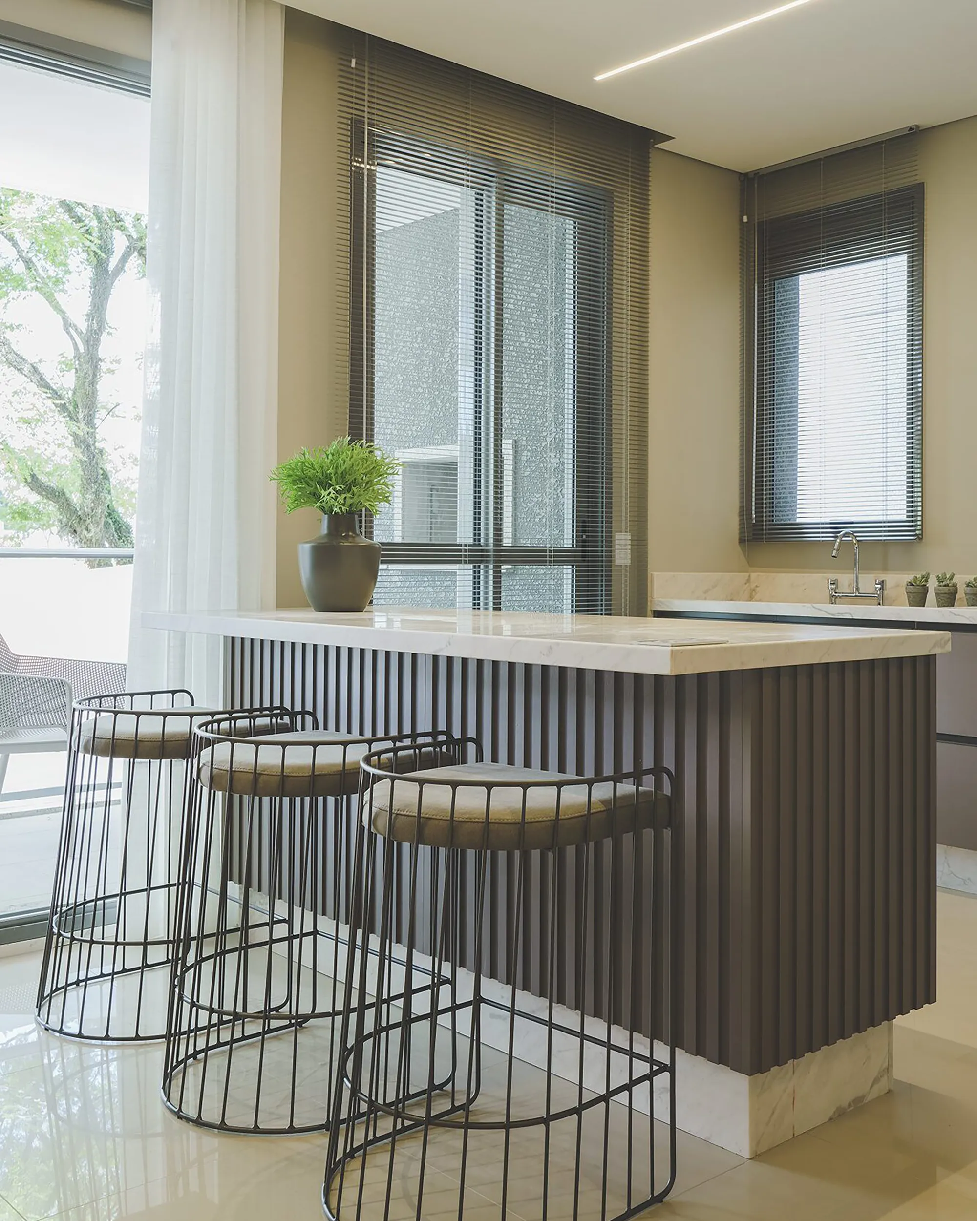 Quando a distância entre a janela e o teto for maior que 30 cm, instalar a cortina próxima ao teto ajuda a valorizar o pé-direito do ambiente.